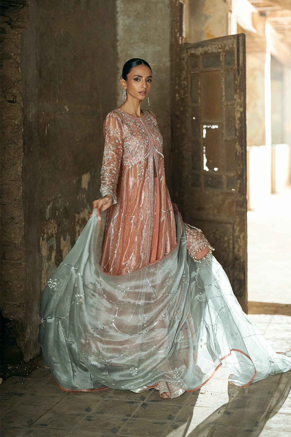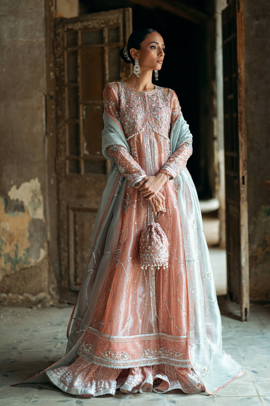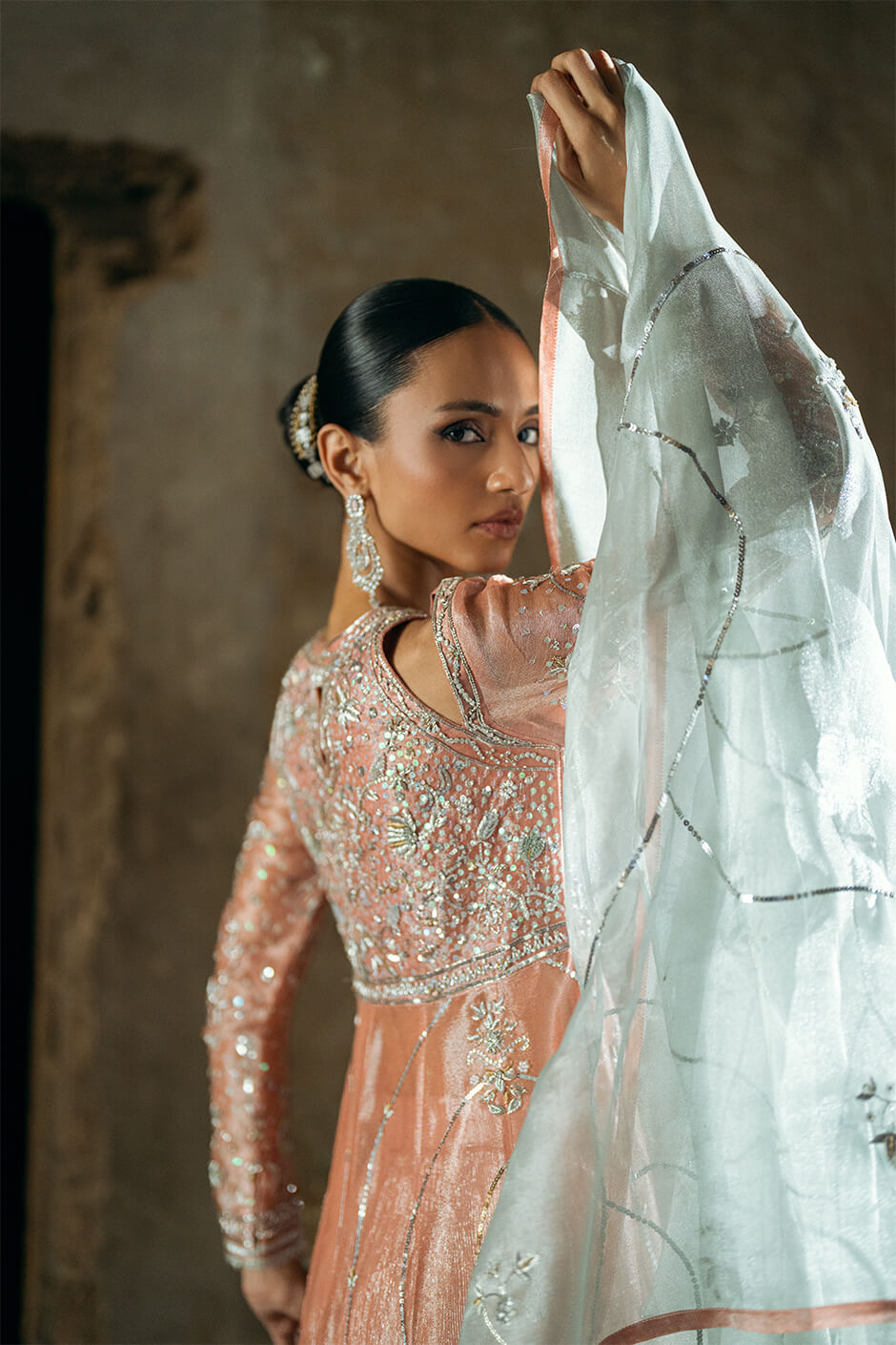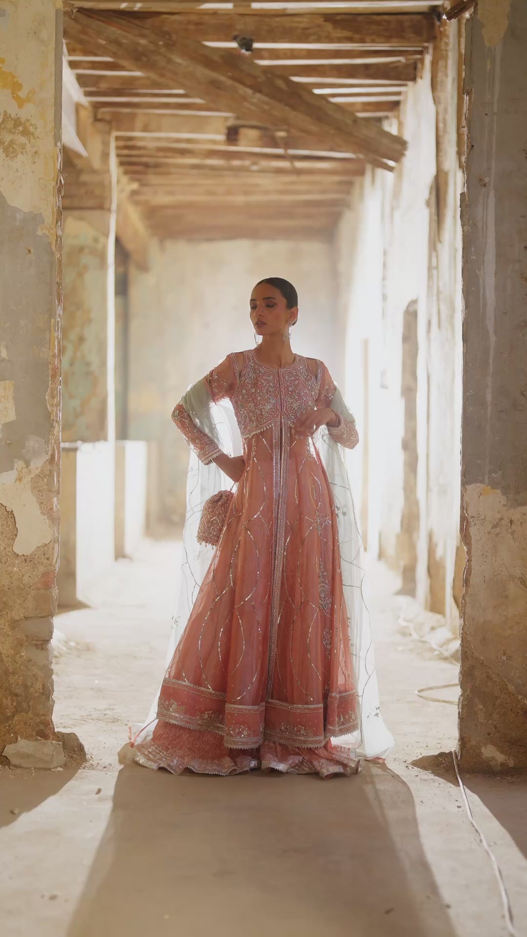 This stunning ensemble features an organza net frock adorned with intricate hand embellishments, sequence work, and cora dabka. Paired with this beautiful frock is a shimmer Dhaka pajama.The dupatta is crafted from pure organza net, measuring 3 yards in length, adding an ethereal touch to the overall look.