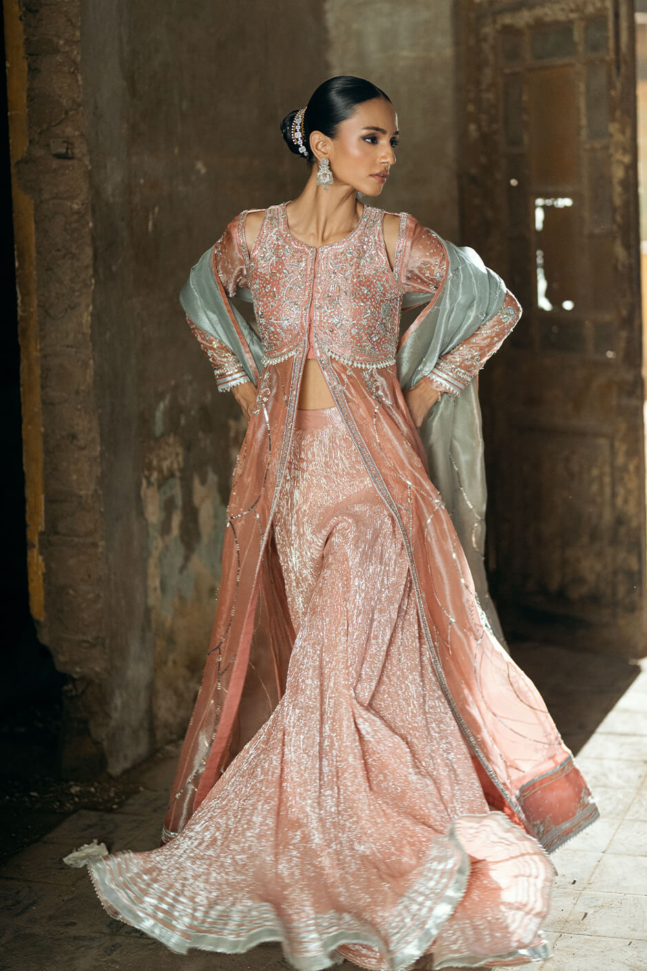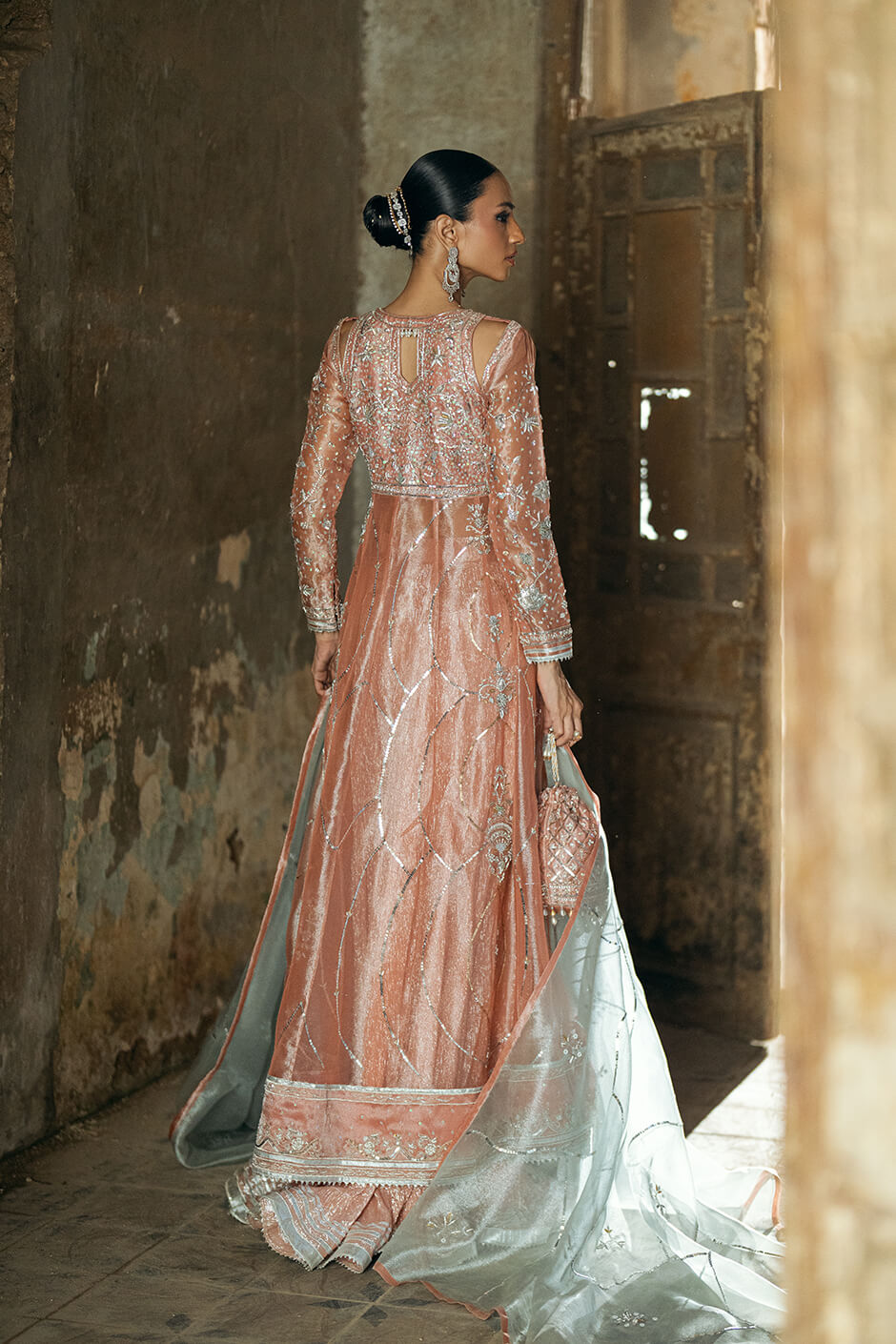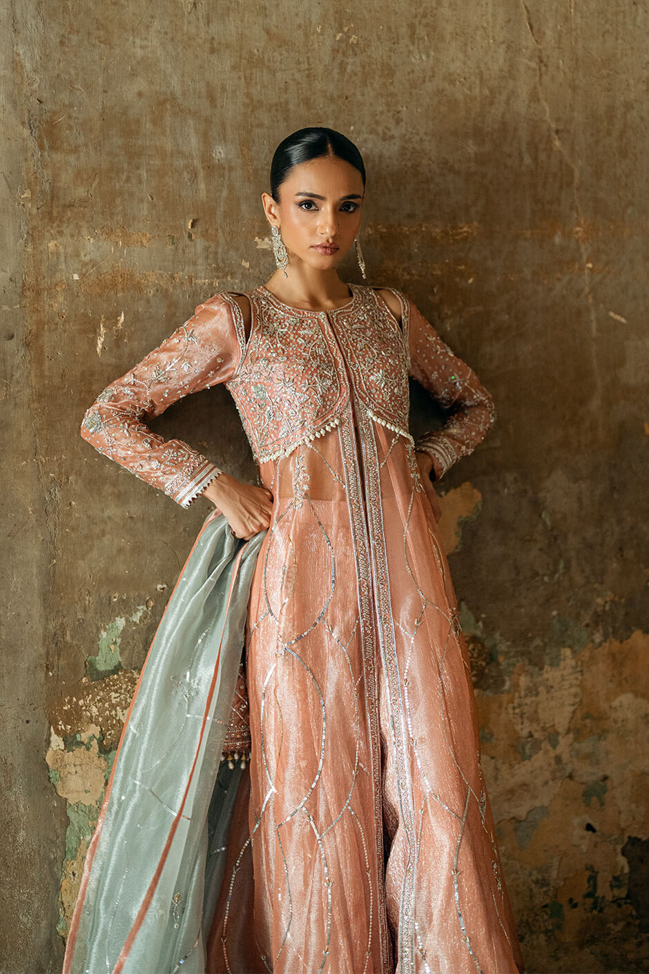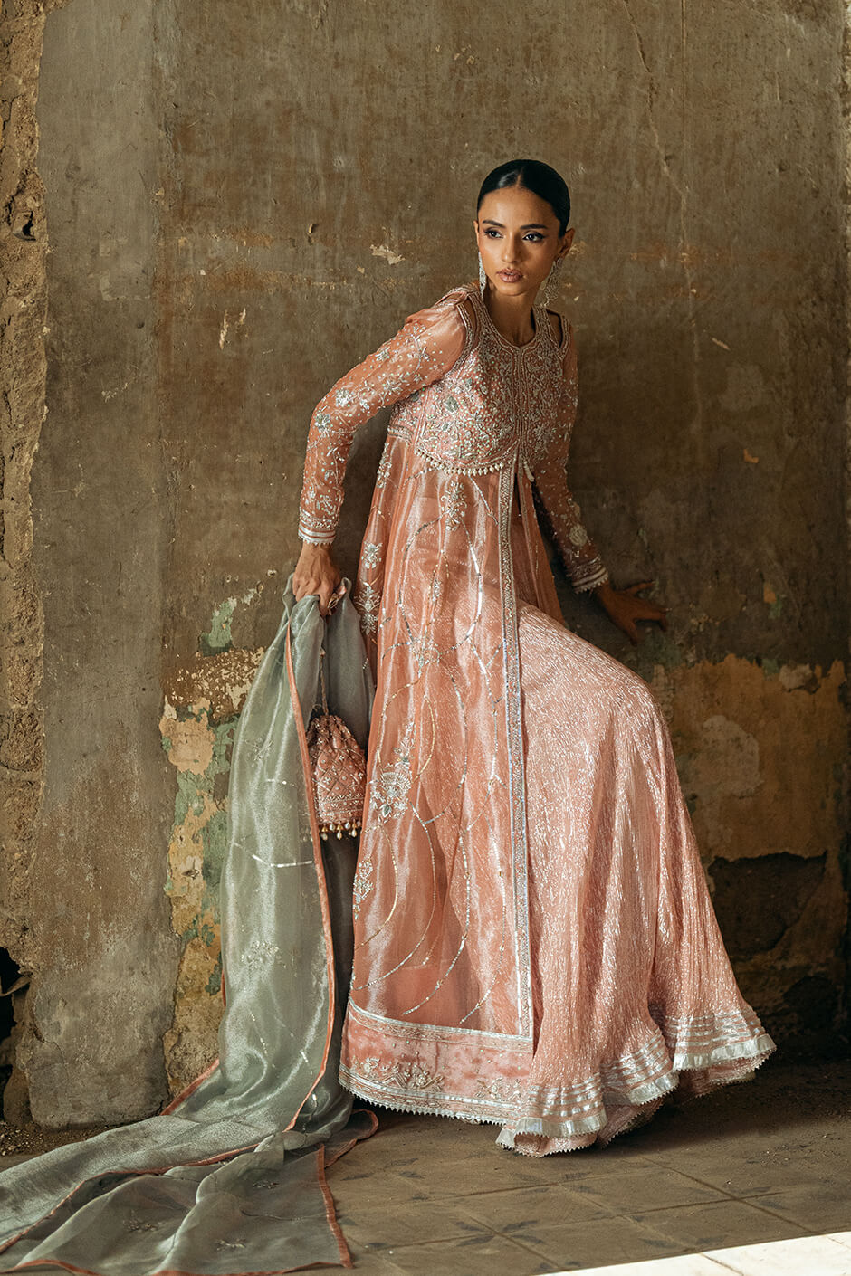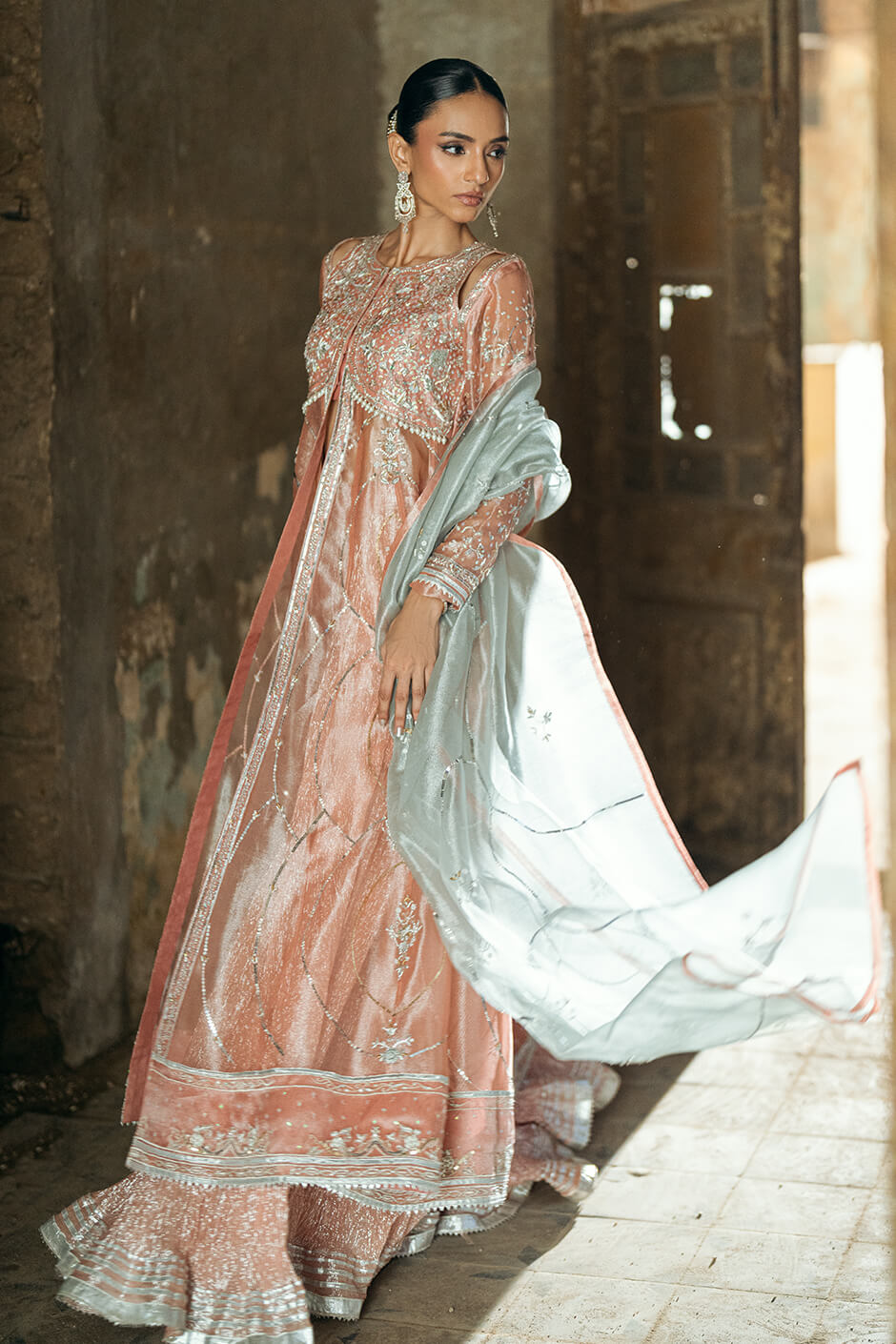 This stunning ensemble features an organza net frock adorned with intricate hand embellishments, sequence work, and cora dabka. Paired with this beautiful frock is a shimmer Dhaka pajama.The dupatta is crafted from pure organza net, measuring 3 yards in length, adding an ethereal touch to the overall look.