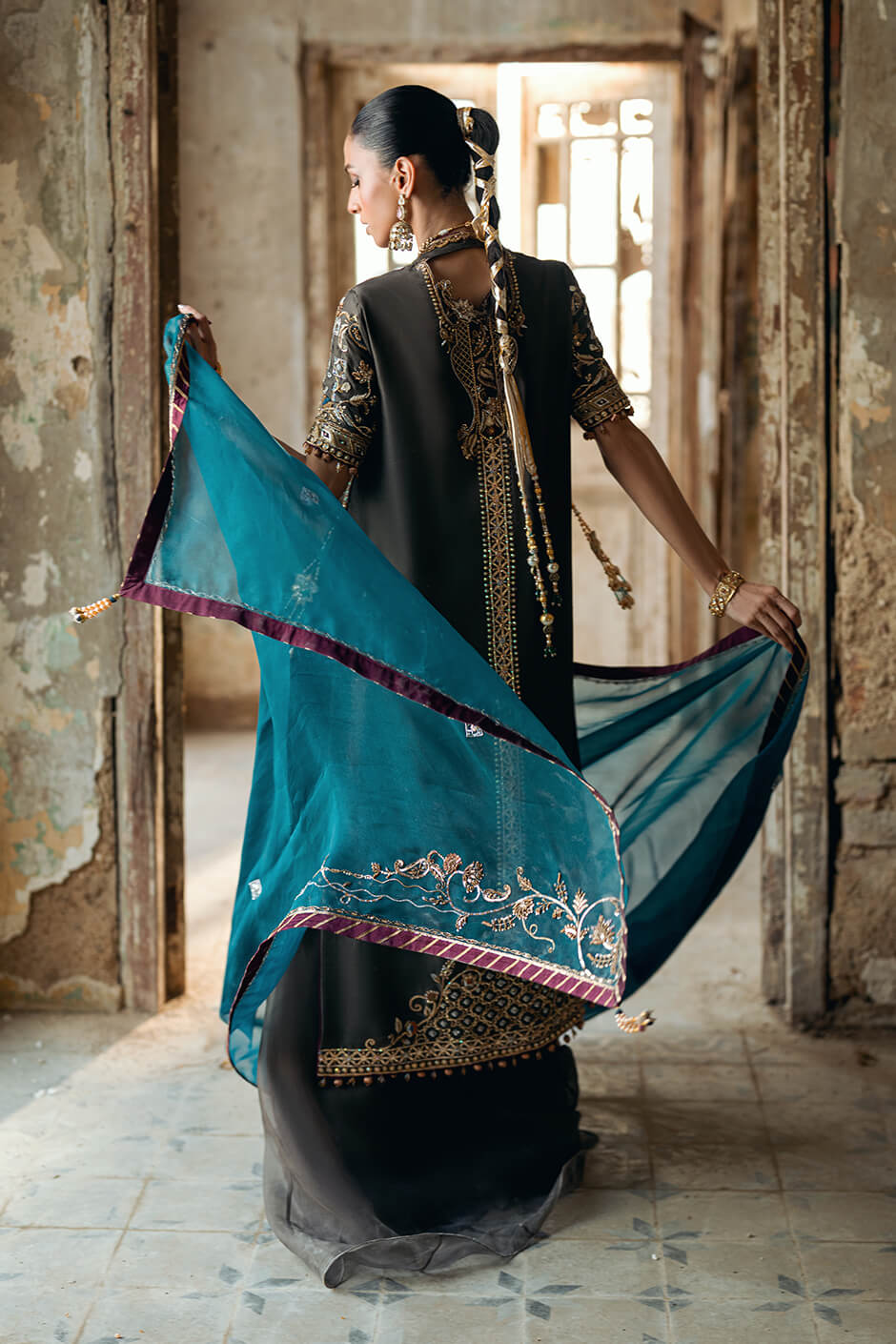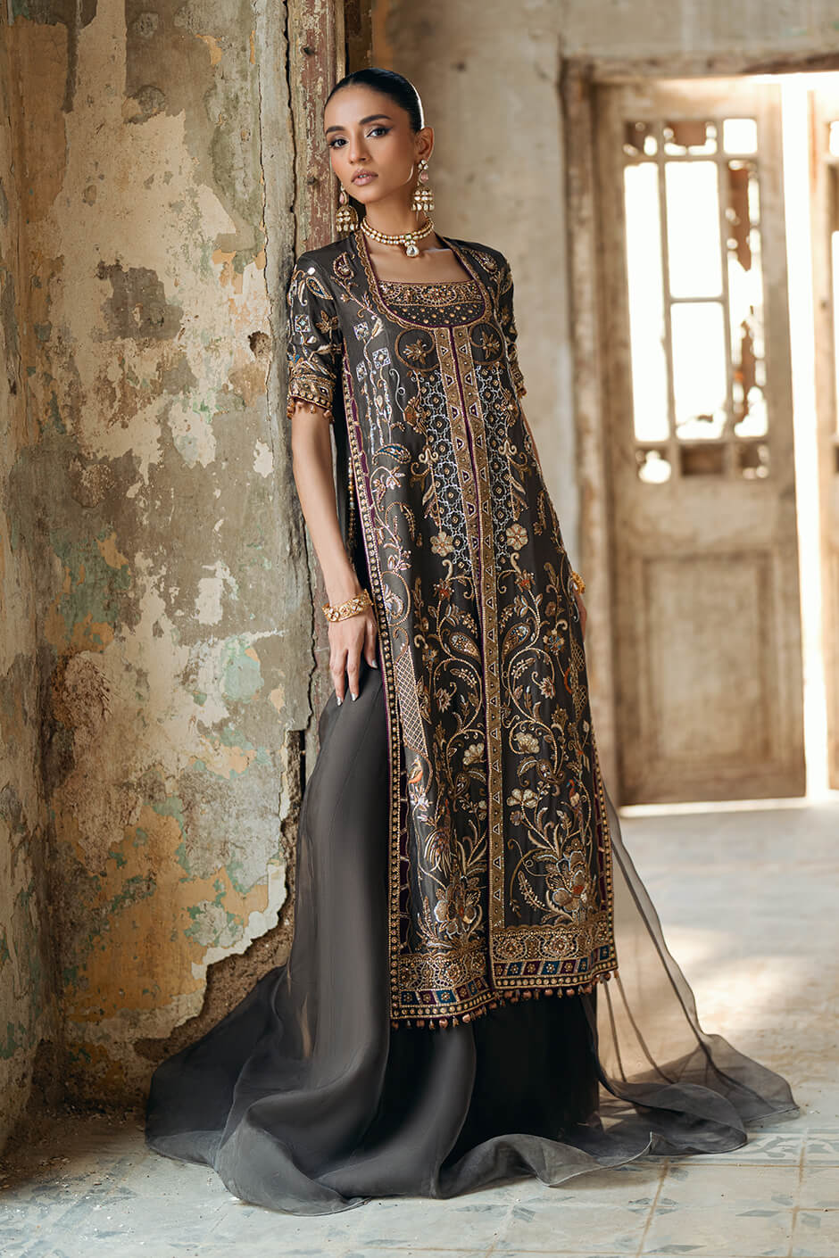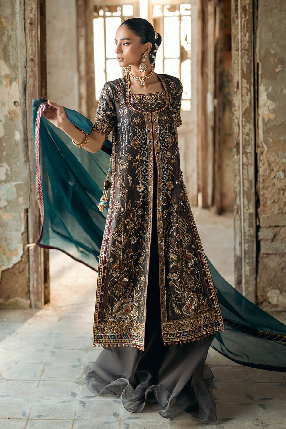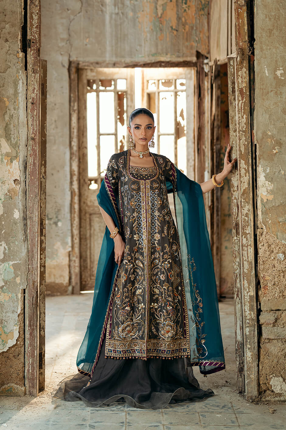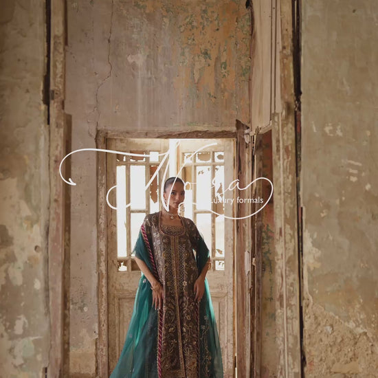 This stunning ensemble features an olive jacket crafted from pure 80-gram raw silk, intricately adorned with gota, cora dabka, pitta work, resham work, and exquisite appliqué work.Paired with this beautiful jacket is a flowing sharara made from pure organza.The dupatta, also crafted from pure organza and measuring 3 yards in length, features intricate gota work, hand embellishments, and embroidery on its borders.