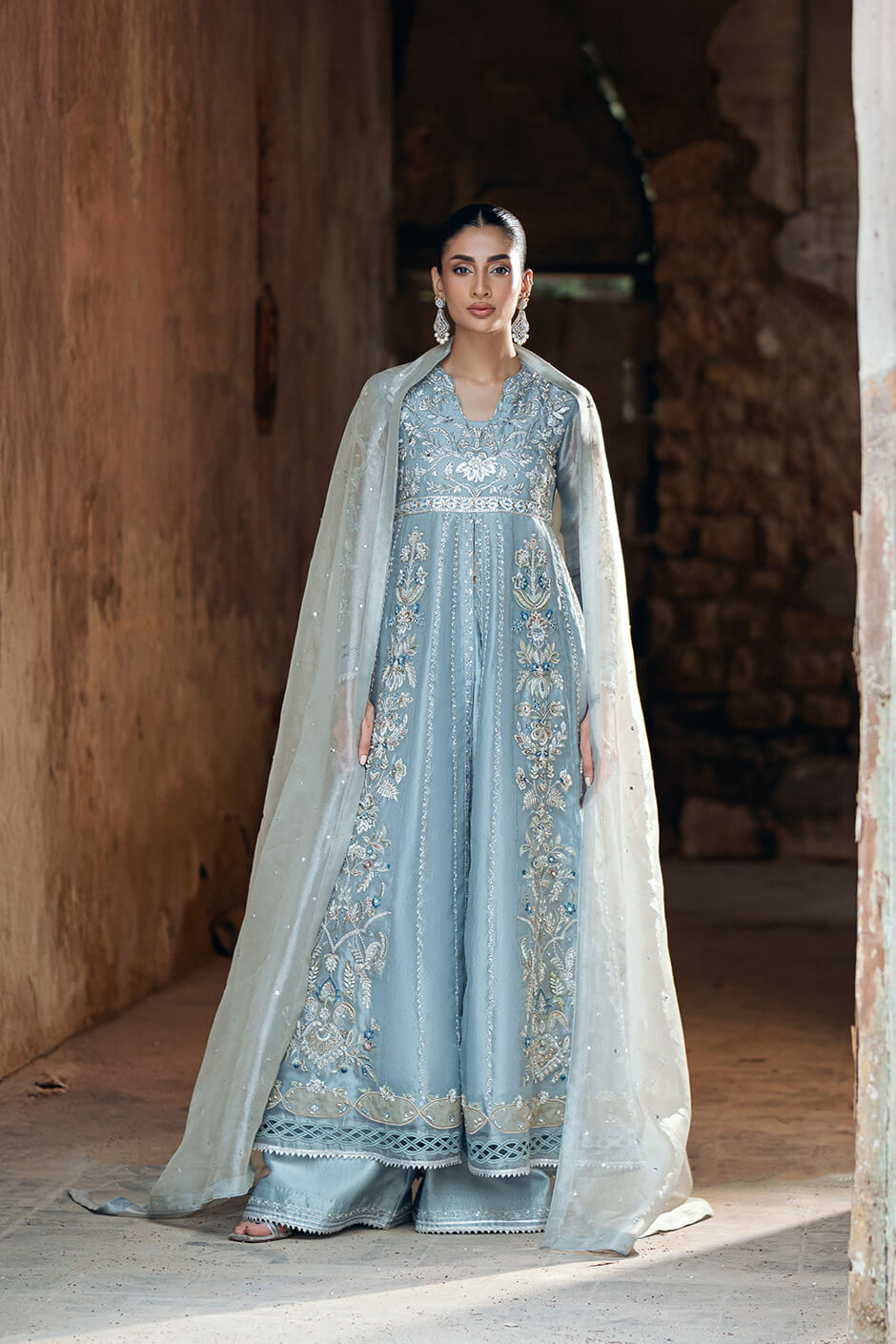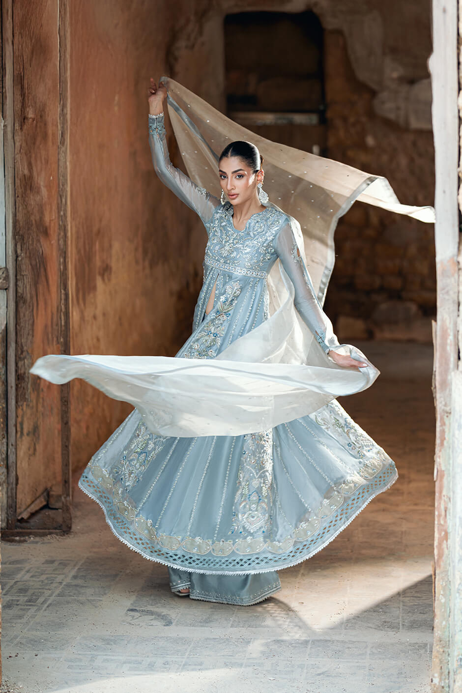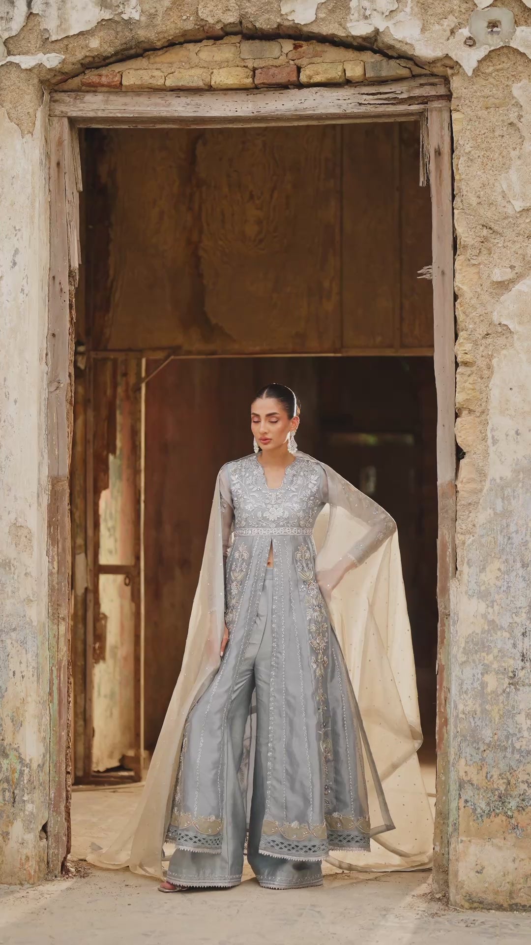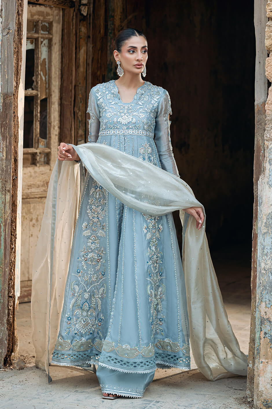 This stunning ensemble features a frock crafted from organza net, intricately adorned with resham and cora dabka work, with exquisite detailing. Paired with this beautiful frock are 2-legged Dhaka pants in striped lawn fabric.The dupatta is made from pure organza net, measuring 3 yards in length, adding a touch of elegance to the overall look.
