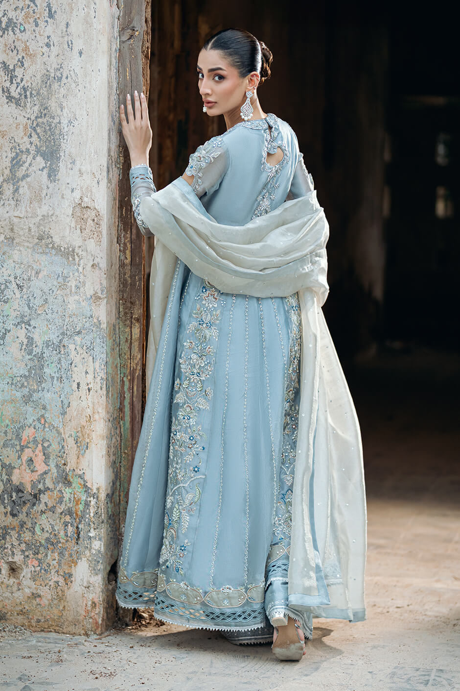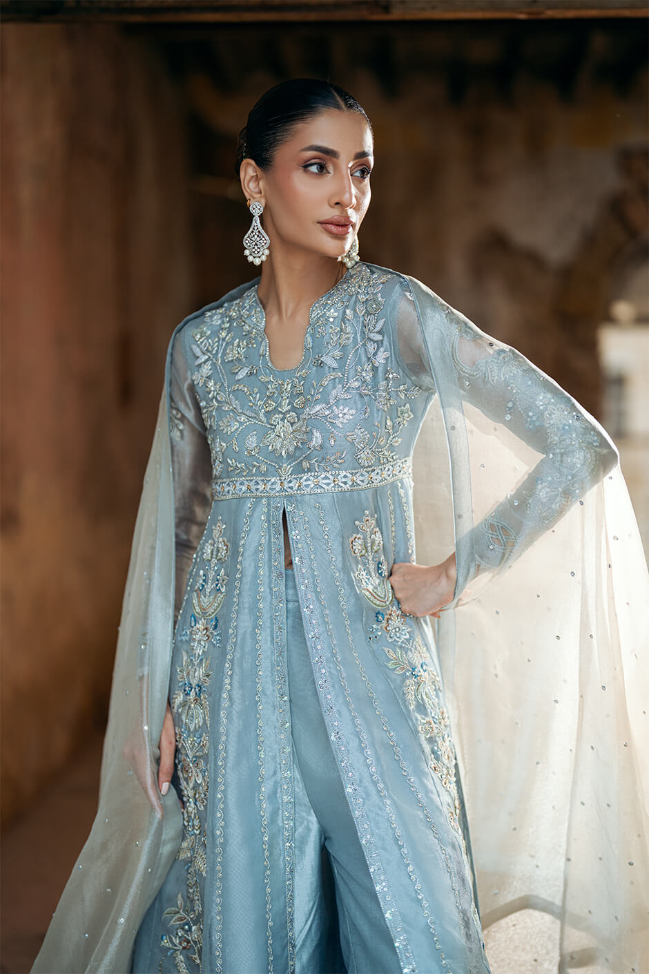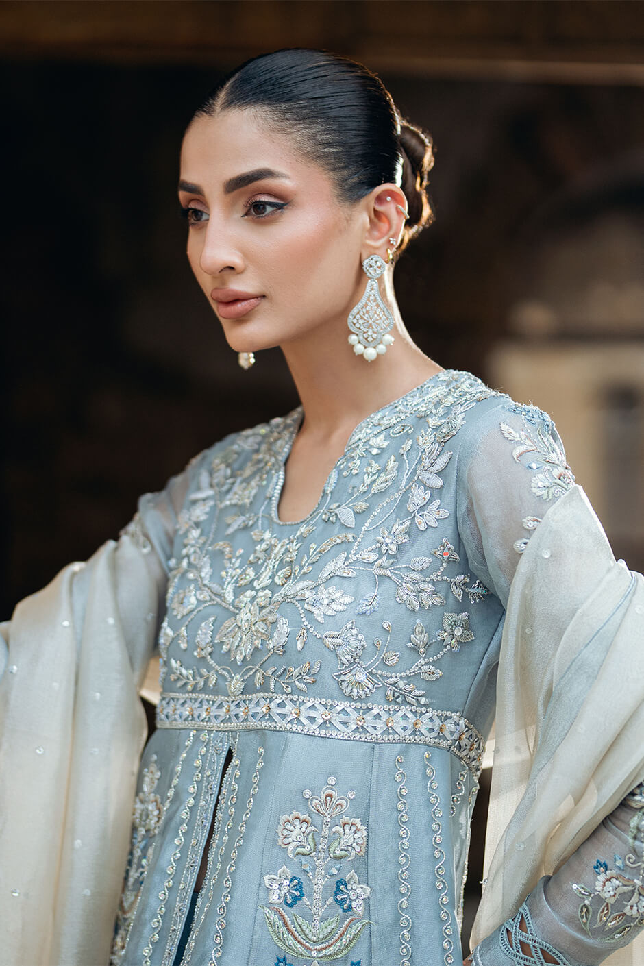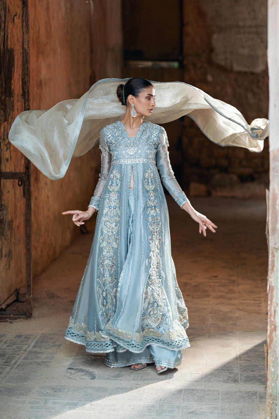 This stunning ensemble features a frock crafted from organza net, intricately adorned with resham and cora dabka work, with exquisite detailing. Paired with this beautiful frock are 2-legged Dhaka pants in striped lawn fabric.The dupatta is made from pure organza net, measuring 3 yards in length, adding a touch of elegance to the overall look.