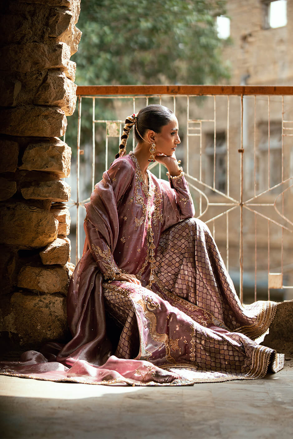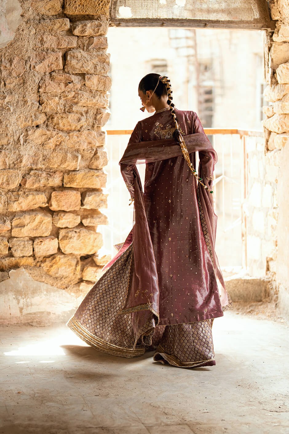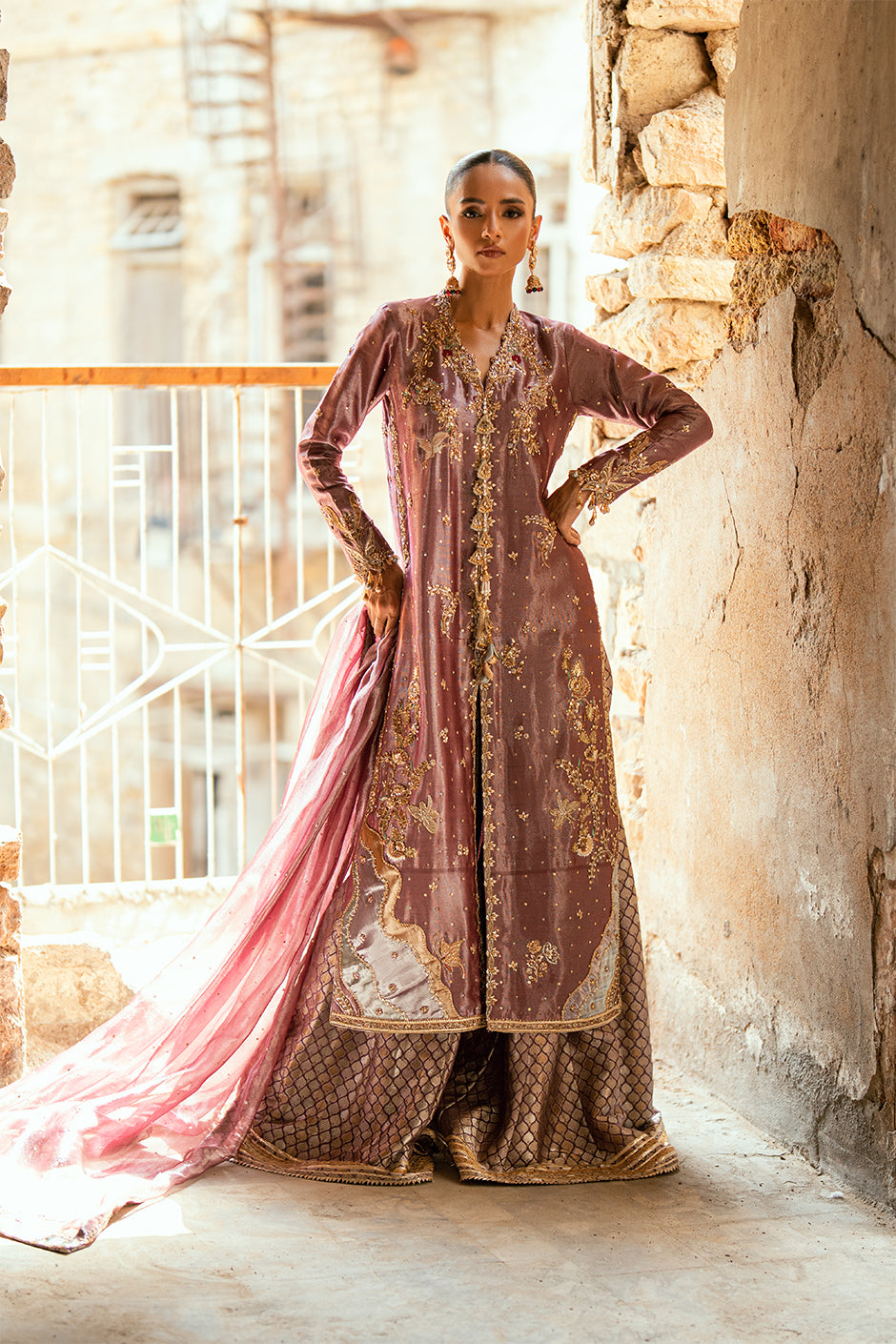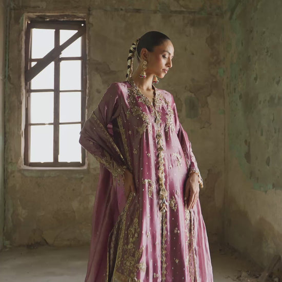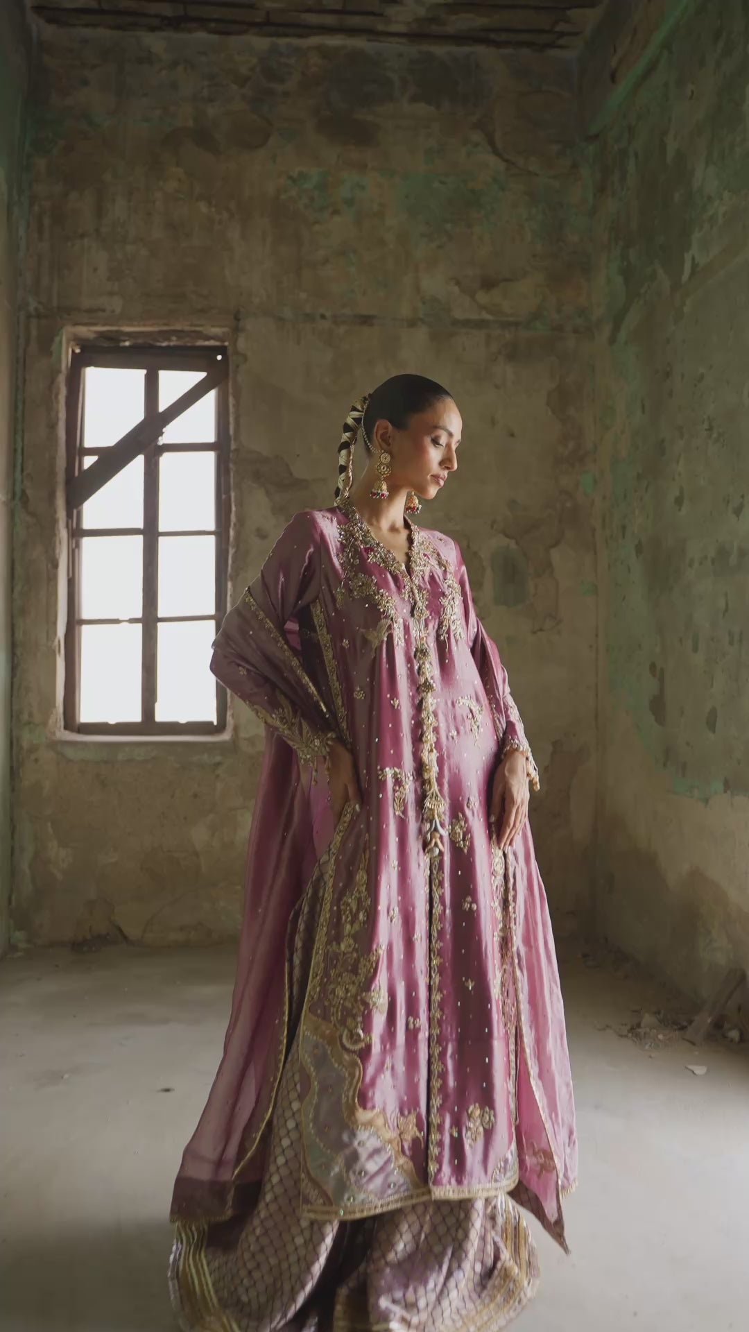 A regal ensemble featuring a front-open jacket crafted in lustrous Stripes Lama, paired with a classic Dhaka pajama in rich pure jamawar. The look is brought to life with intricate hand embellishment and traditional Cora Dabka work, blending heritage craftsmanship with a bold, structured silhouette. Perfect for making a powerful yet elegant statement.