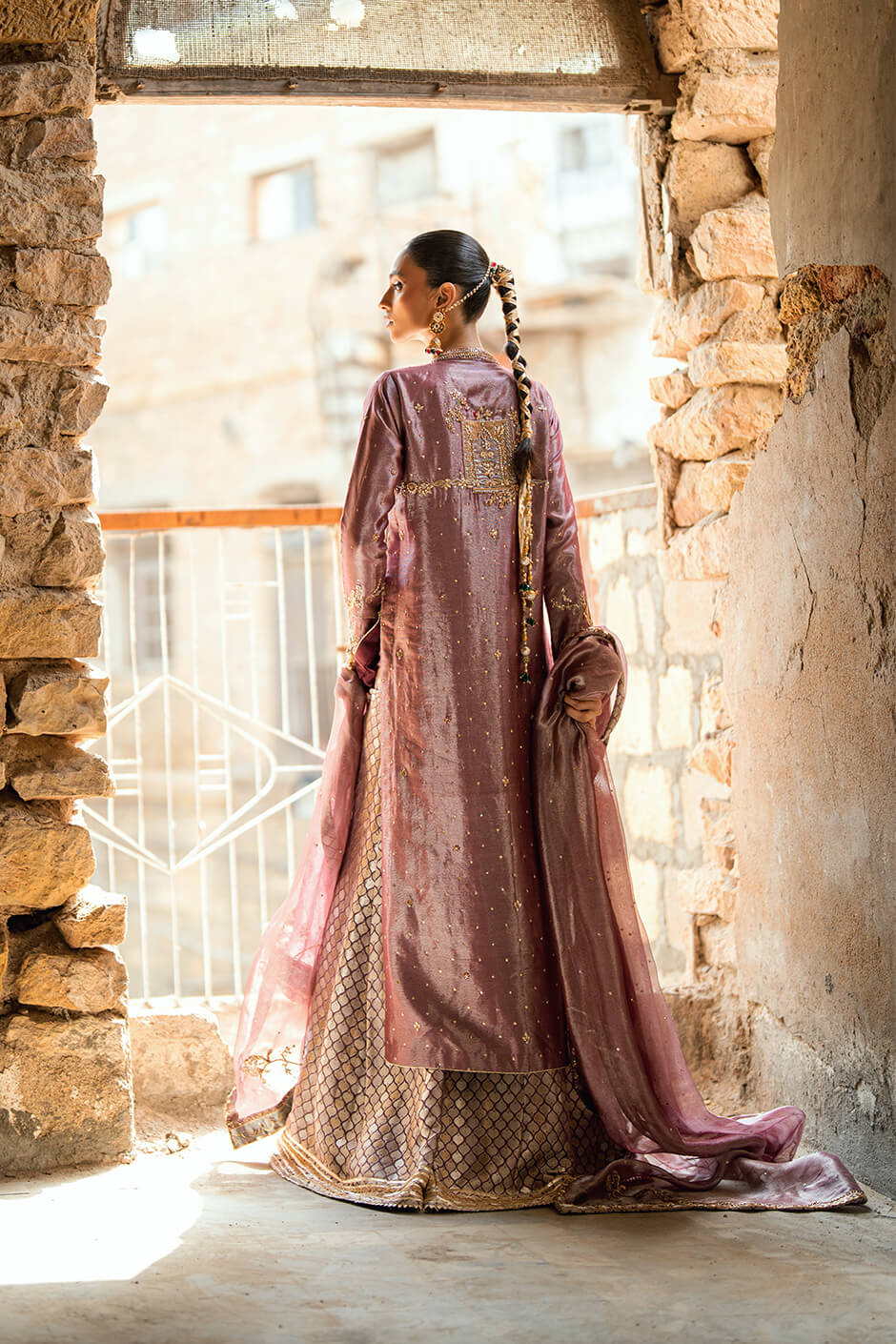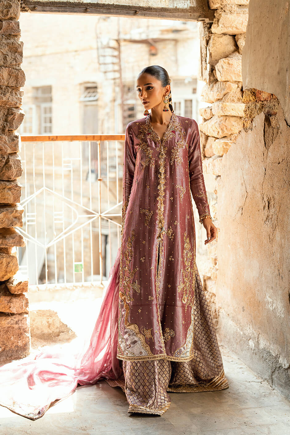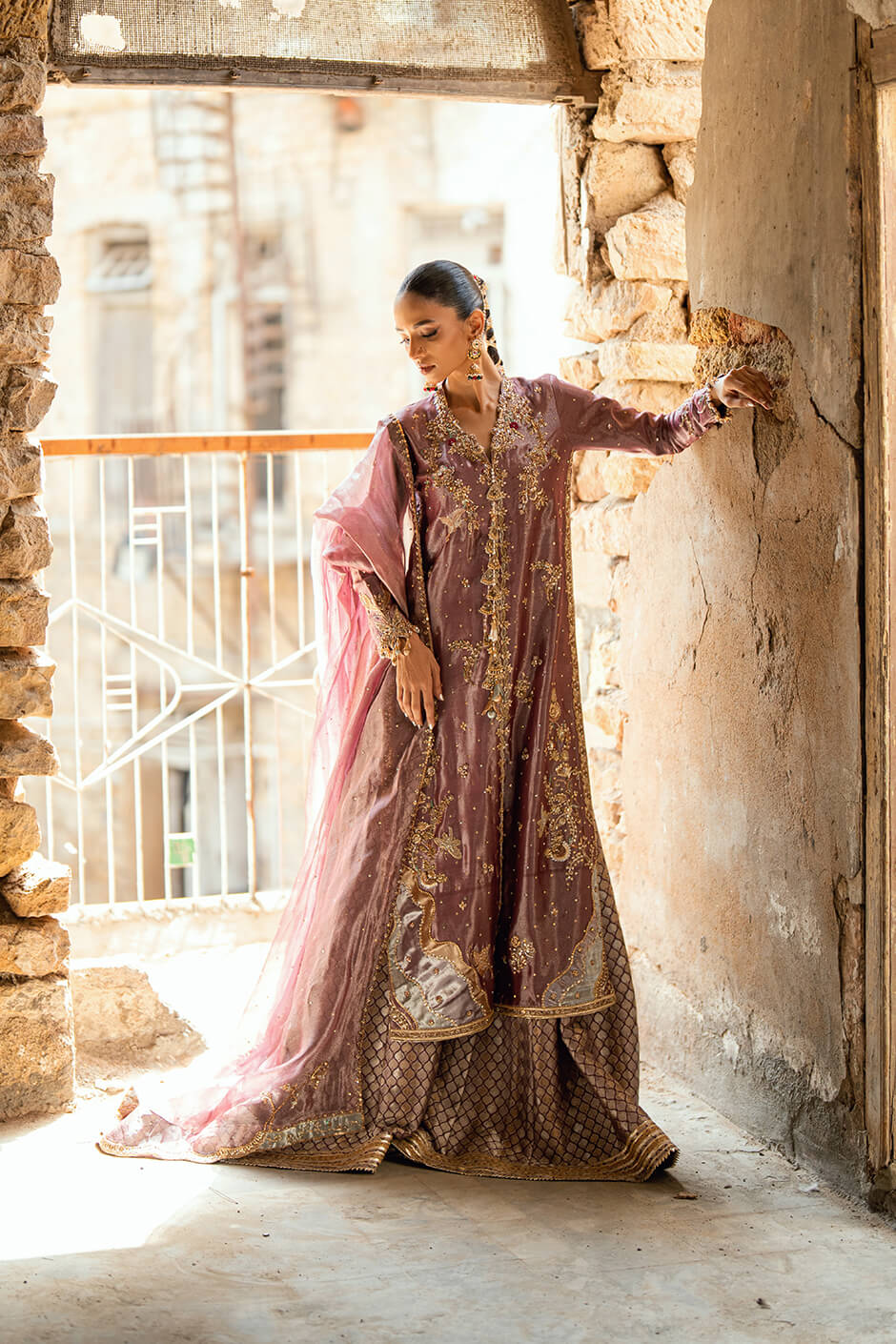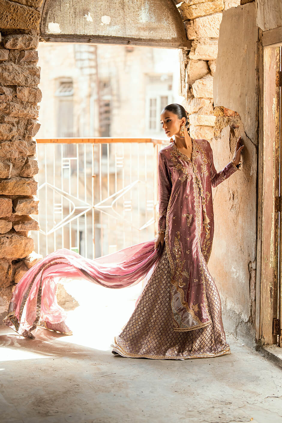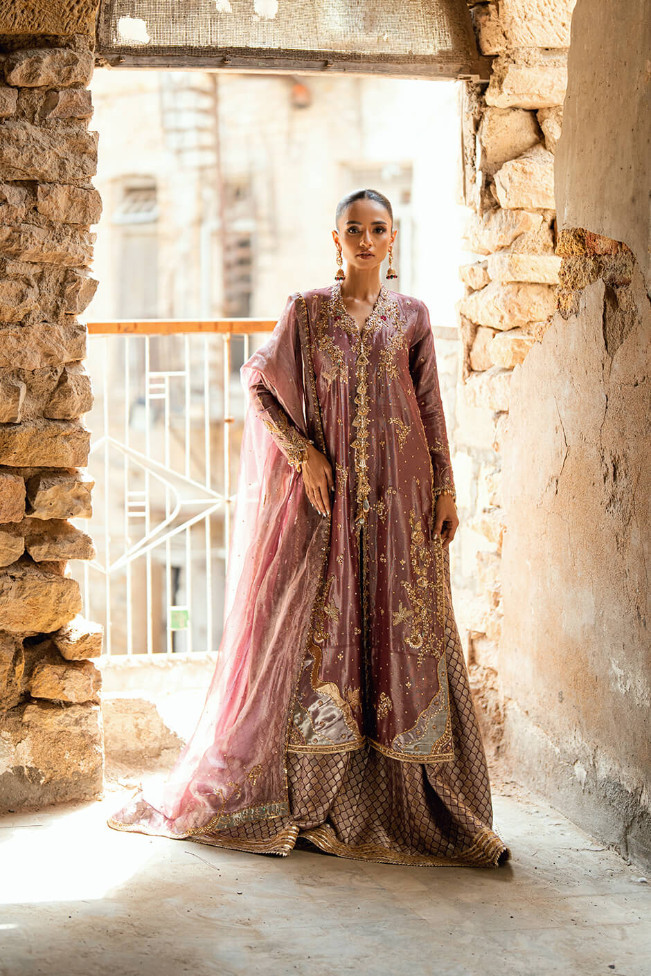 A regal ensemble featuring a front-open jacket crafted in lustrous Stripes Lama, paired with a classic Dhaka pajama in rich pure jamawar. The look is brought to life with intricate hand embellishment and traditional Cora Dabka work, blending heritage craftsmanship with a bold, structured silhouette. Perfect for making a powerful yet elegant statement.