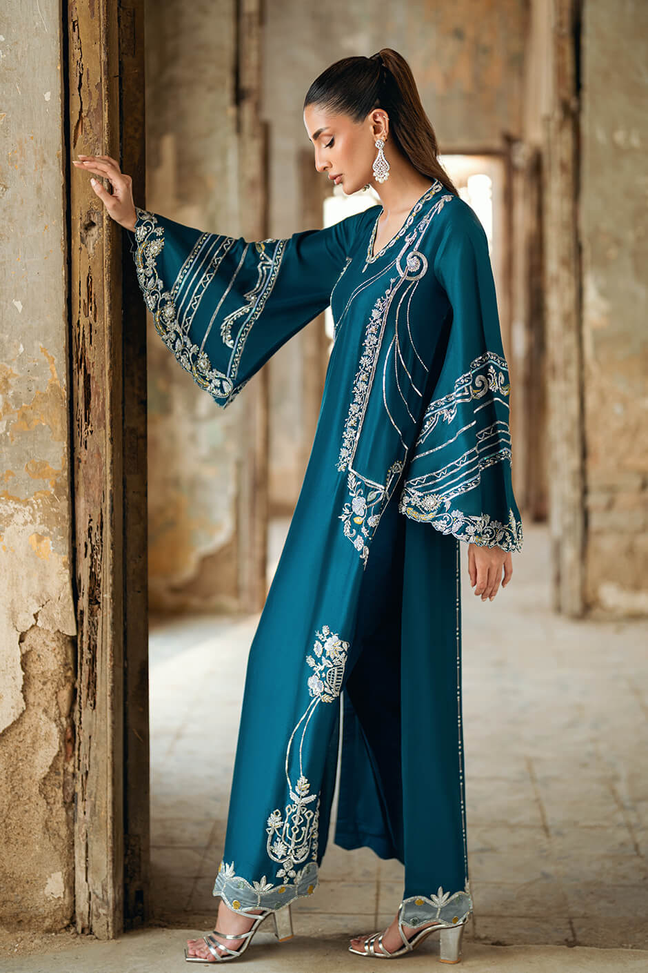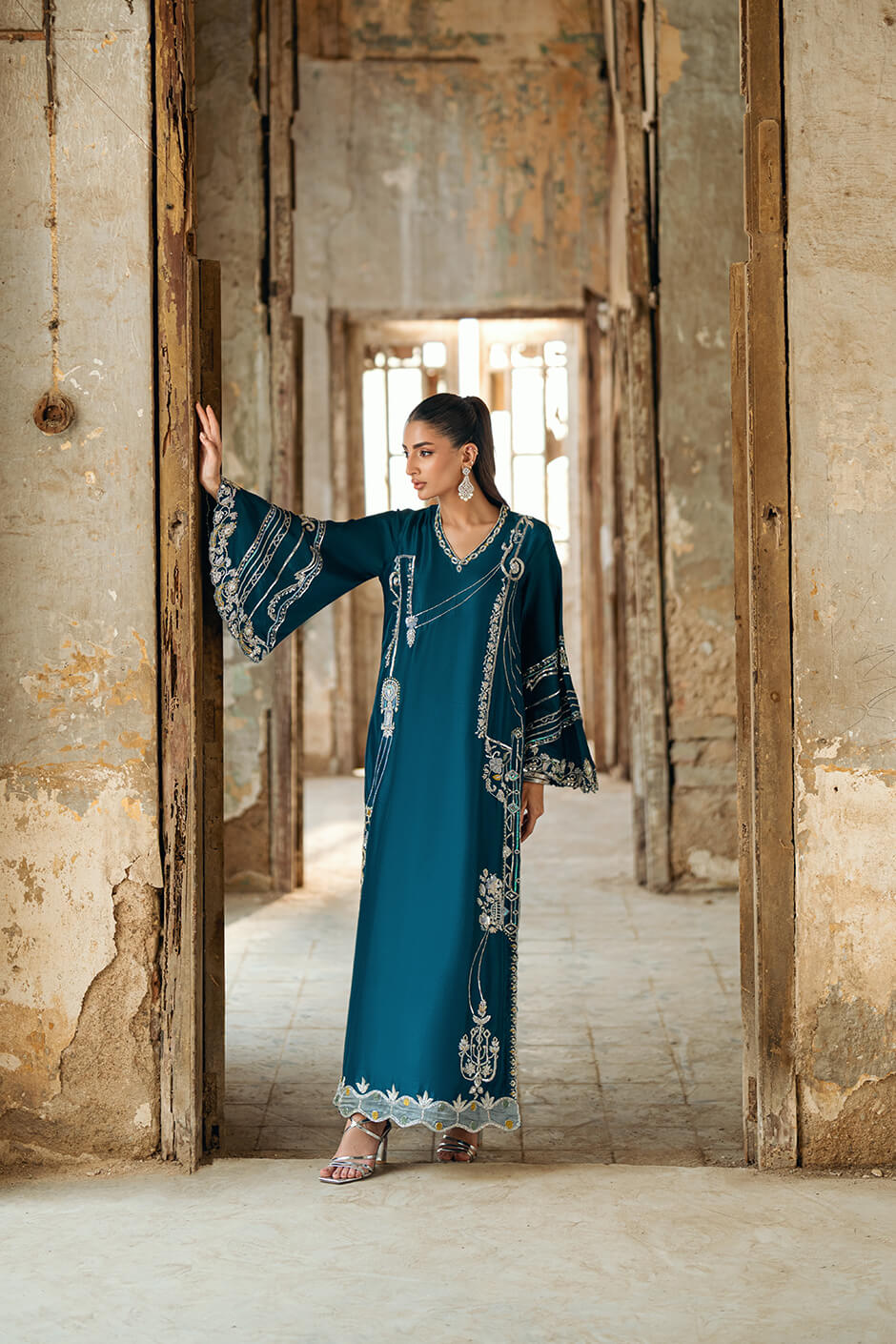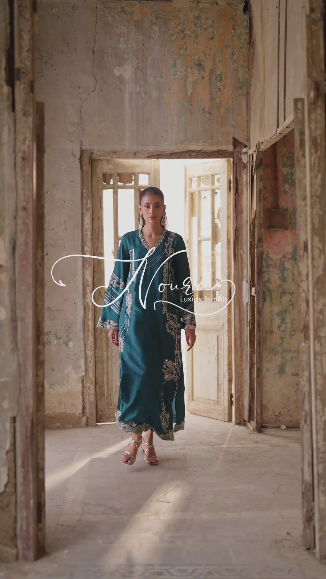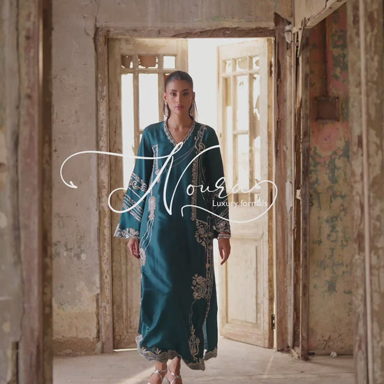 A statement kaftaan crafted from rich pure rawsilk, this piece blends timeless elegance with modern ease. Featuring intricate appliqué work and detailed Cora Dabka embellishment, the silhouette flows effortlessly while making a bold impact. Luxurious yet understated, it’s perfect for those who favor refined drama with a touch of heritage.