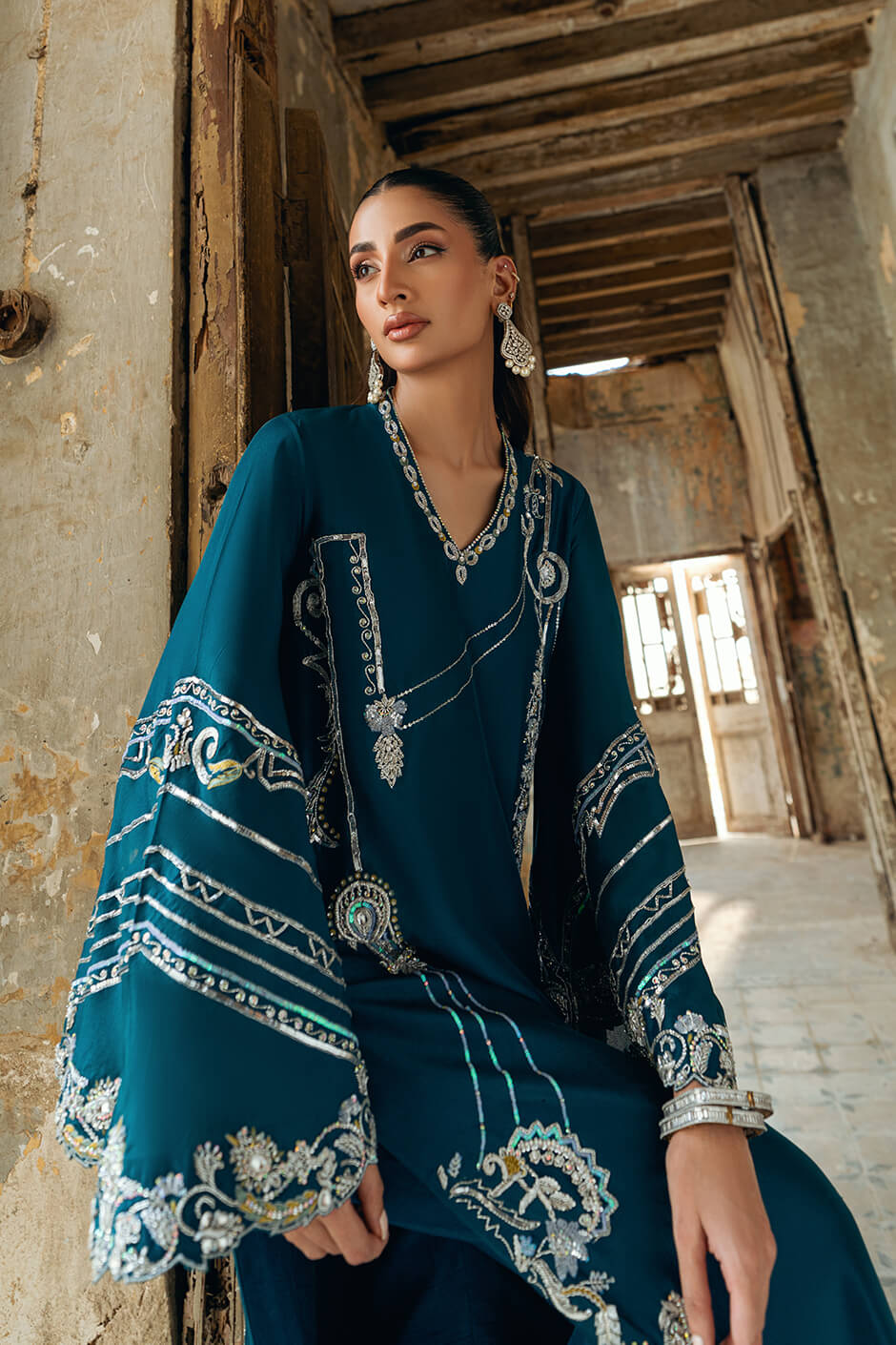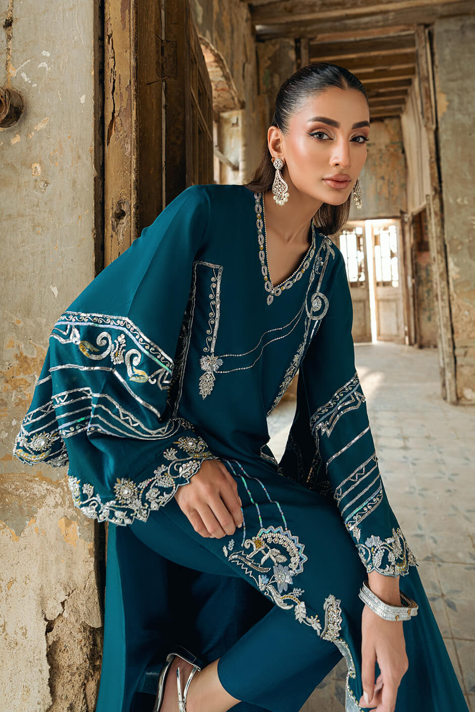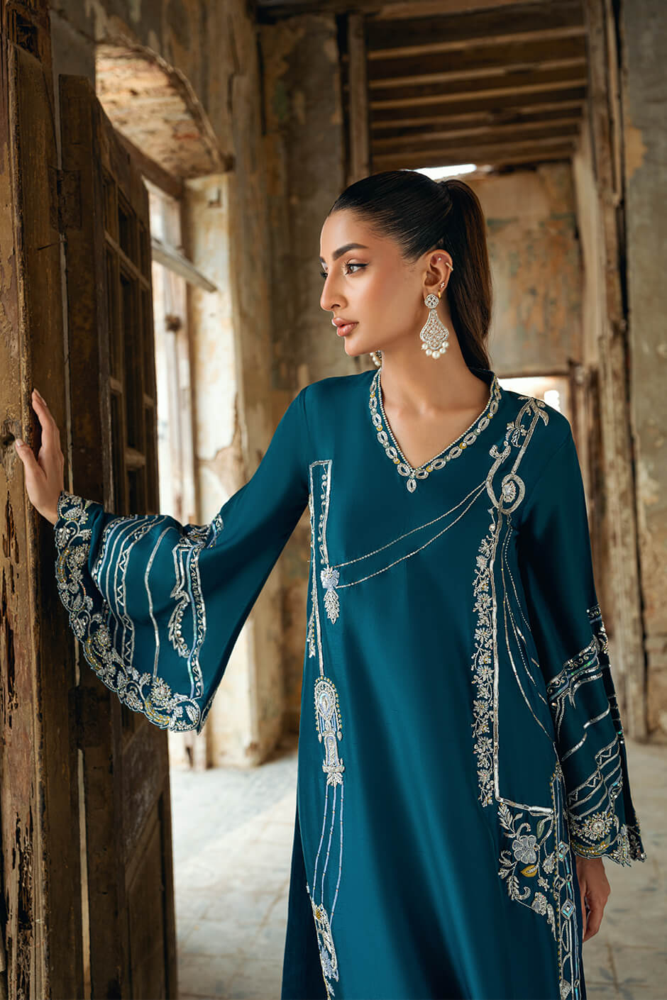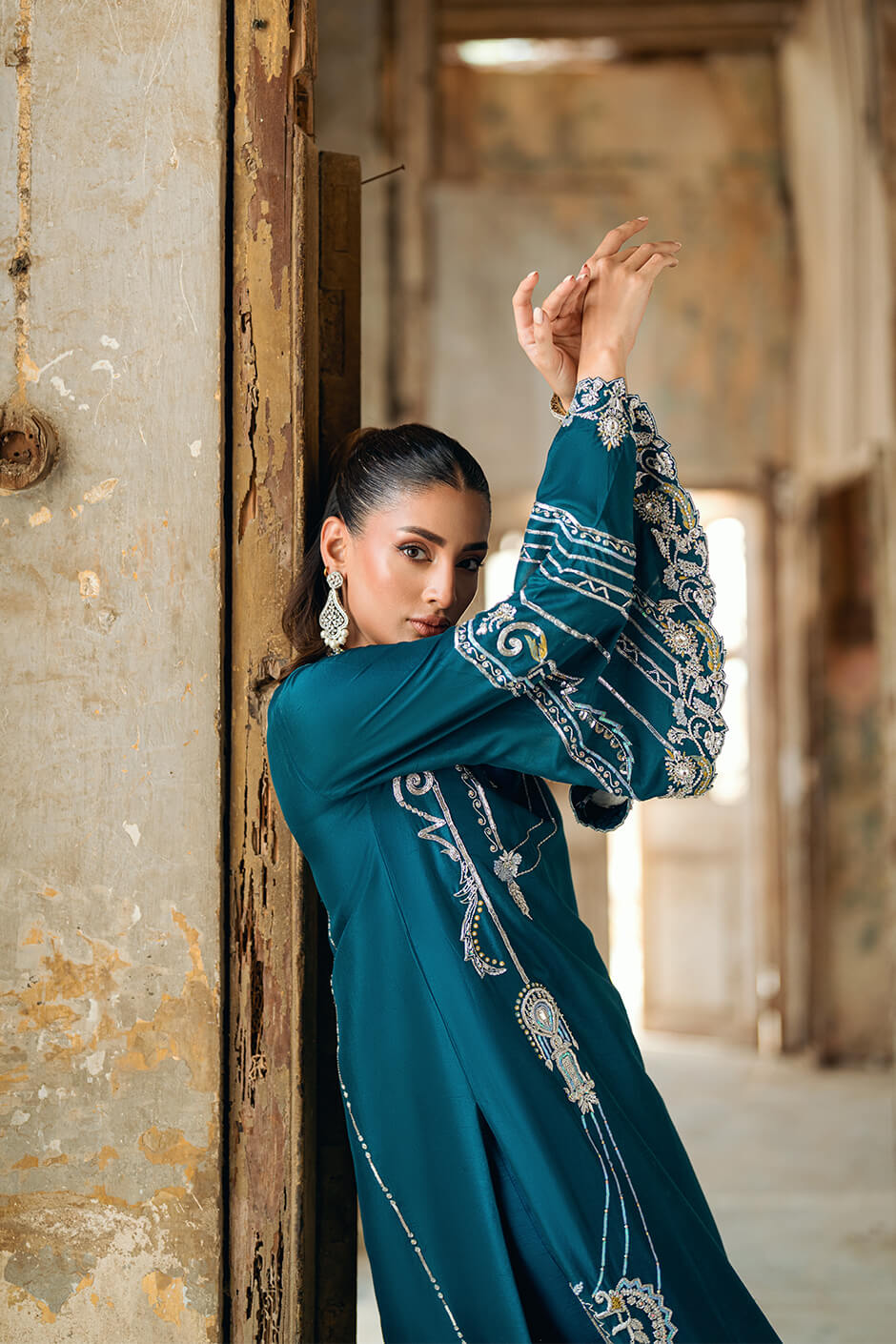 A statement kaftaan crafted from rich pure rawsilk, this piece blends timeless elegance with modern ease. Featuring intricate appliqué work and detailed Cora Dabka embellishment, the silhouette flows effortlessly while making a bold impact. Luxurious yet understated, it’s perfect for those who favor refined drama with a touch of heritage.